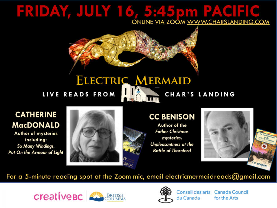 I’m going to be reading at a pub in Port Alberni! Virtually, that is, and you can come too. C. C. Benison (Doug Whiteway) and I will be doing readings from our respective books and chatting as part of the Electric Mermaid Reading series coming to you from Char’s Landing Pub in Port Alberni, BC. Kudos to the folks at Char’s Landing for making their pub into a social and arts centre for the Port Alberni community. They are fine people.
